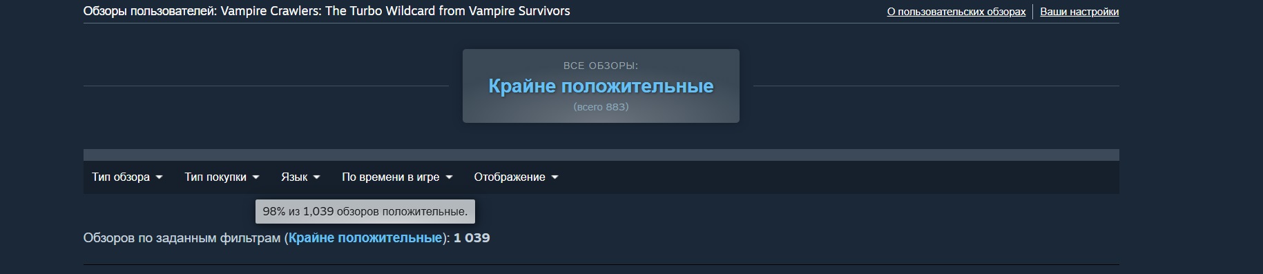 В Steam у Vampire Crawlers «крайне положительный» пользовательский рейтинг на основе более 1 тыс. обзоров (98% одобрения). Его пиковый онлайн достиг 21 147 игроков одновременно, тогда как Vampire Survivors в своё время привлекла 77 061 игроков одновременно.