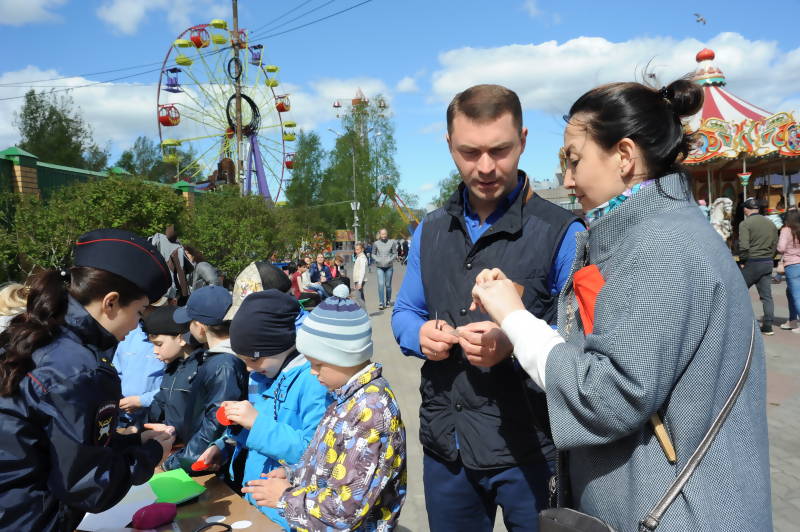 Вместе с детьми мастер-класс по изготовлению светоотражающего кулона прошел заместитель главы Архангельска - руководитель аппарата Николай Евменов. Традиционно 1 июня в «Потешном дворе» работает образовательная площадка Госавтоинспекции.