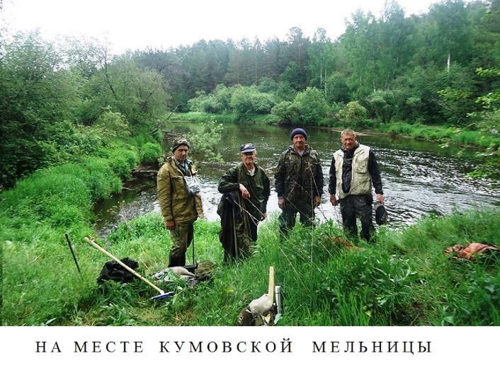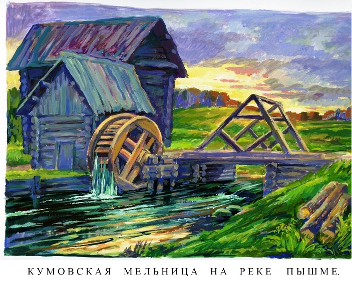 Но всё-таки нам повезло, одна фотография попала в наши руки. На ней изображены останки плотины и мельничных сооружений самой известной мельницы нашего района – Кумовской. Эта мельница проработала дольше всех остальных. Фотографию мы естественно увеличили, слегка подреставрировали и по нашей просьбе известный асбестовский художник П.А.Попов нарисовал картину. На ней отражена ситуация, когда Кумовская мельница работала в полную силу. Сейчас любой желающий даже не бывавший на месте, глядя на картину может представить как выглядела Кумовская мельница на начало ХХ века.