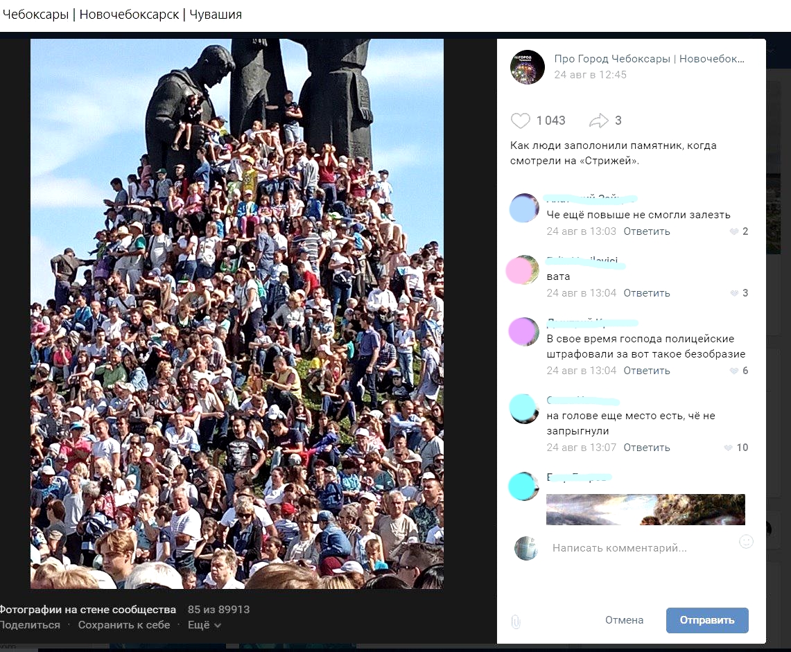 Между тем в центре города творилось невообразимое — празднующие взяли в кольцо мемориал, где горит Вечный огонь и установлен монумент Воинской Славы, плотно облепив холм и ступени со всех сторон. На самом знаковом для Чувашии месте, связанном с Великой Отечественной войной и символизирующим прах миллионов погибших, всё было усеяно людьми. Не гнушаясь, отдельные зрители вскарабкались даже на сам монумент. Было утоптана и утрамбована не только мемориальная территория, но и память.