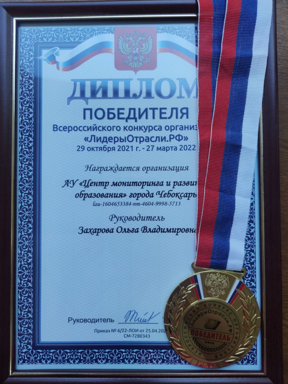 По итогам экспертной оценки Всероссийского конкурса организаций «Лидеры Отрасли. РФ» Центр мониторинга и развития образования г. Чебоксары признан победителем. В конкурсе приняли участие более 51 тысячи организаций из разных регионов России, в том числе город Чебоксары.