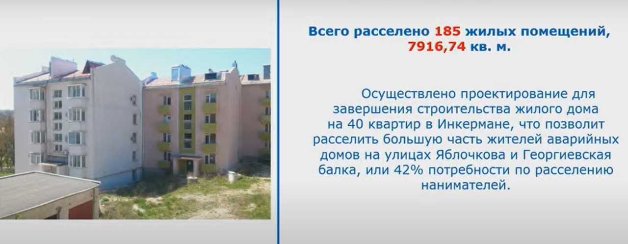 Сейчас в Инкермане завершено проектирование дома на 40 квартир для расселения жителей аварийных домов, расположенных на улицах Яблочковой и в Георгиевской балке. В следующем году планируется завершить его строительство.