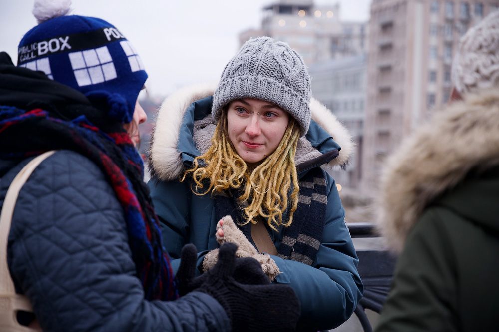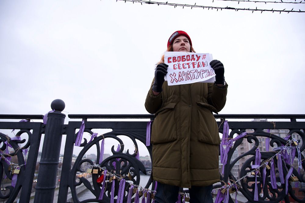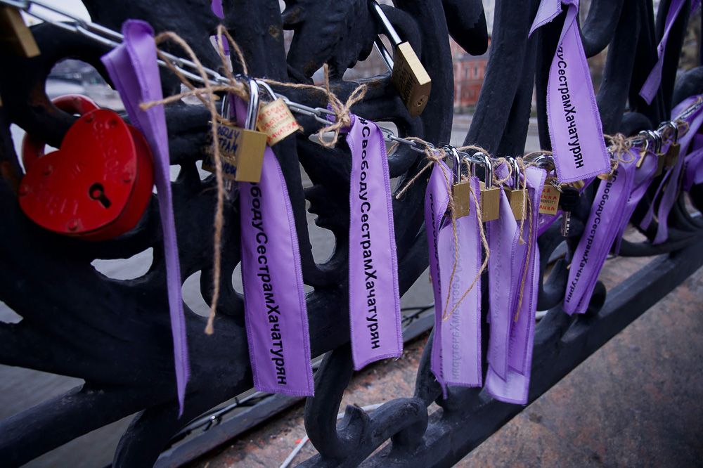 Акция называется «Мост сестер». Еще до начала самих пикетов организаторы раздали участникам ленты с надписью «Свободу сестрам Хачатурян». Позже они прикрепили ленты к самому Патриаршему мосту с помощью замков.