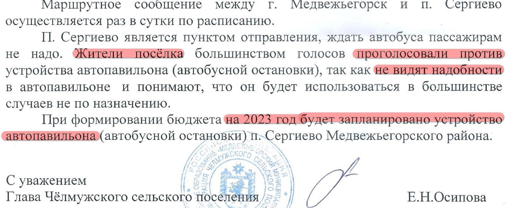 — Весной 2023 года республиканской прокуратурой была проведена проверка, по результатам которой заместитель прокурора Медвежьегорского района Иовлев подтвердил факт отсутствия остановочного комплекса в поселке Сергиево и вынес представление об устранении нарушения. Казалось бы, что ещё нужно — установи людям автобусную остановку и забудь о проблеме. Но нет, — пишут жители Сергиево.