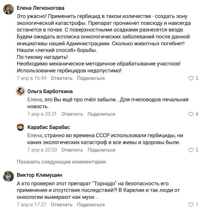 В комментариях местные жители выразили обеспокоенность таким решением властей. По их мнению, гербициды могут проникнуть в почву и навредить животным и насекомым, особенно пчелам. Также возможны и последствия для здоровья человека, включая риски онкологических заболеваний. Жители считают такой метод борьбы «легким путем», который может создать новые проблемы вместо успешной борьбы с сорняком.