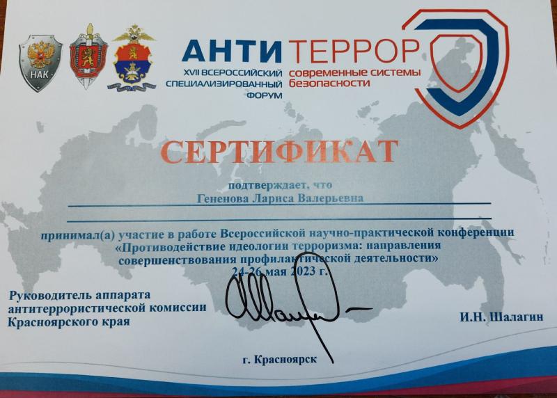 В городе Красноярске в МВДЦ "Сибирь" в период с 24 по 26 мая 2023 года при поддержке Национального антитеррористического комитета и Федерального агенства по делам молодёжи состоялся XVII Всероссийский специализированный форум "Современные системы безопасности - Антитеррор". В мероприятии по поручению министерства культуры Бурятии, приняла участие представитель хореграфического колледжа, методист Гененова Л.В.