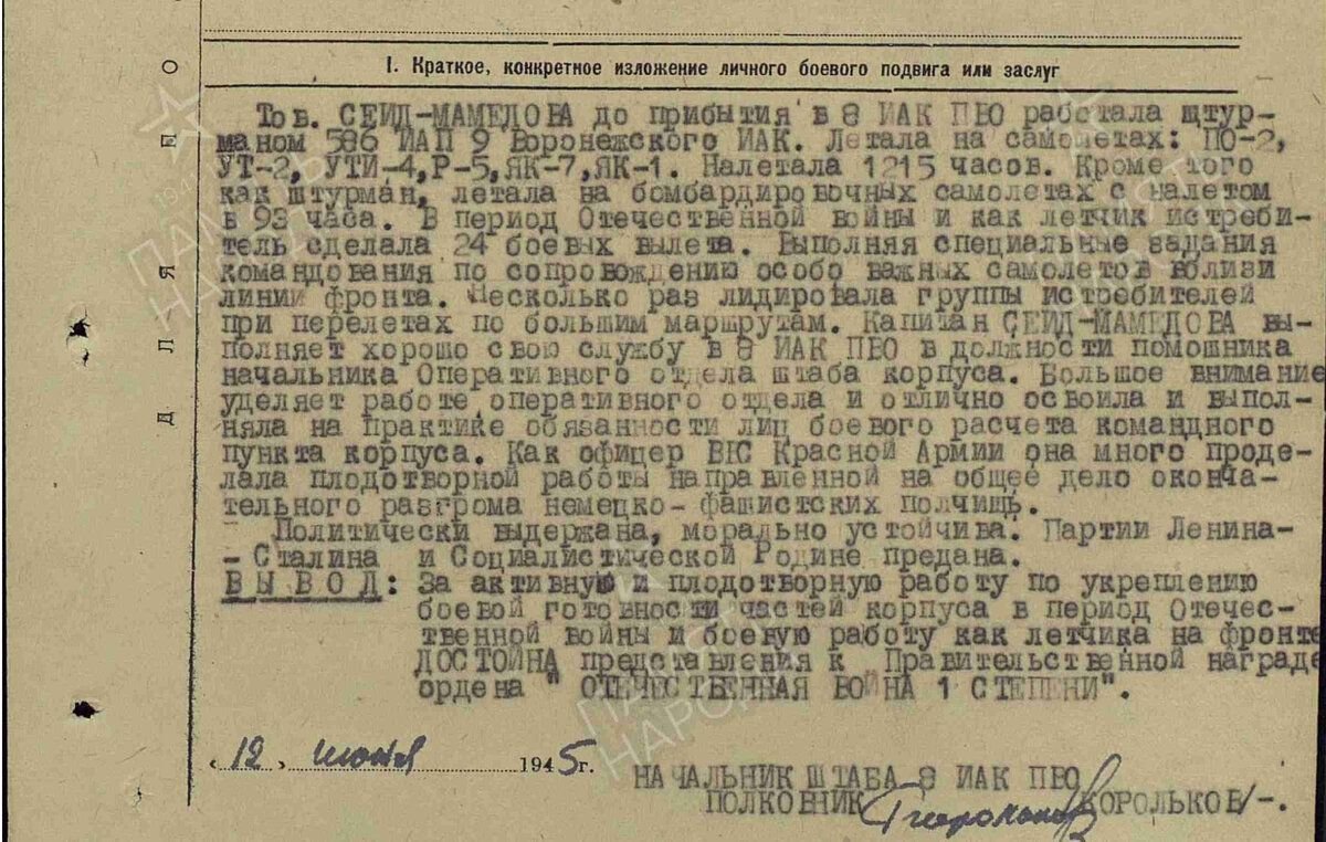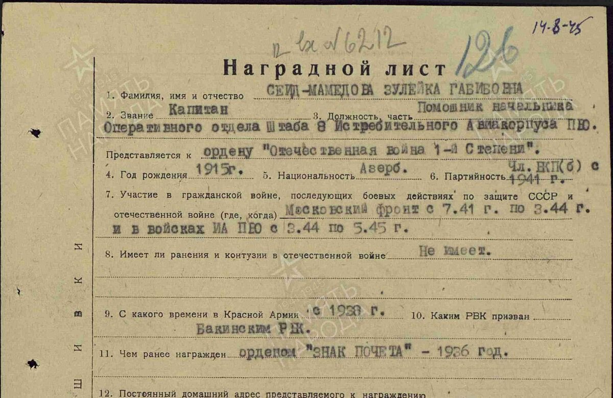 Но согласно наградному листу на вручение ордена Отечественной войны I степени, подписанному 12 июня 1945 года, за годы войны капитан Сеидмамедова совершила 24 боевых вылета, налетала 1215 часов и войну закончила в должности помощника начальника опер.отдела штаба 8-го истр.авиакорпуса ПВО (прим. - согласно наградному листу от 12.06.1945 г.). Также Зулейха Габибовна награждена орденом Красной Звезды, участвовала в воздушных боях над Сталинградом, на Курской Дуге, Корсунь-Шевченковской операции.