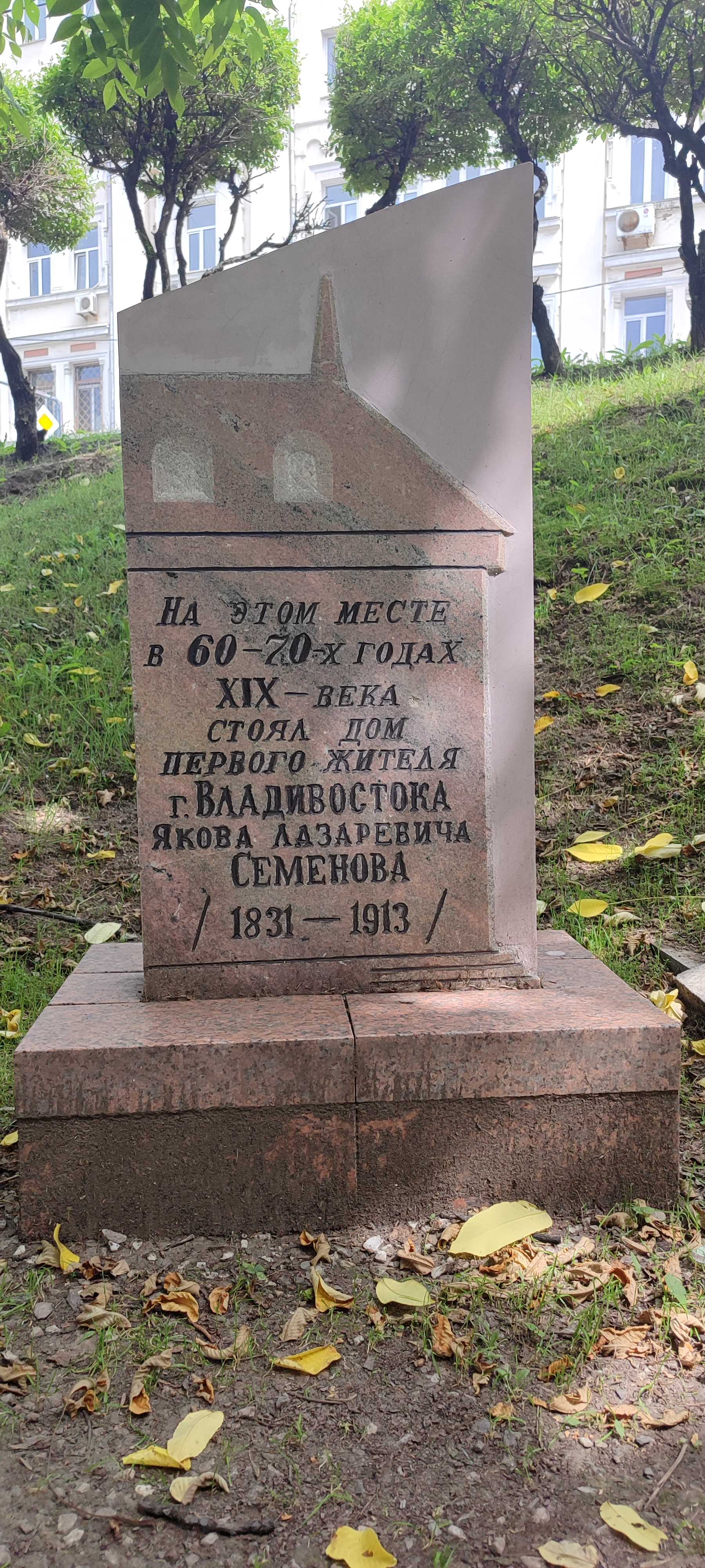Есть в историческом центре Владивостока малозаметный небольшой памятный знак, установленный примерно в том месте, где более полутора столетий назад отстроил свой дом первый гражданский житель тогда ещё военного поста Владивосток Яков Лазаревич Семёнов, информирует «Тихоокеанская Россия», ТоРосс.