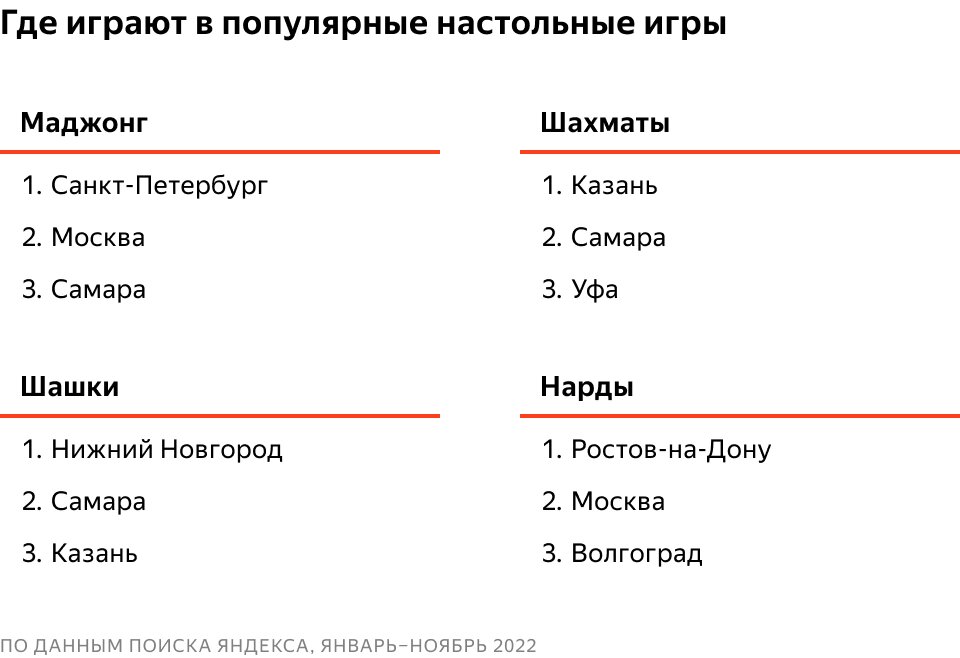 В компании отдельно проанализировали, в каких городах чаще ищут браузерные версии классических настольных игр. Например, маджонг — в Москве и Санкт-Петербурге, шахматы и шашки — в Казани, Самаре и Нижнем Новгороде, а нарды — на юге России и в столице.