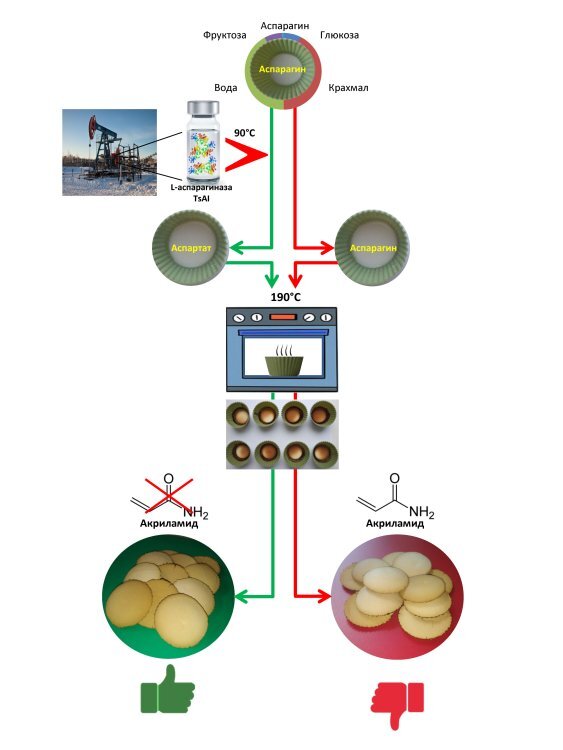 Thermococcus sibiricus — микроорганизм, выделенный из нефтяного месторождения в Западной Сибири. Он характеризуется способностью расти при повышенных температурах (порядка 80 °С). Учёные выделили из него гипертермофильный фермент — L-аспарагиназ, который расщепляет аспарагин до аспарагиновой кислоты и аммиака. Затем они взяли «лабораторное тесто», содержащее глюкозно-фруктозный сироп, аспарагин и крахмал в качестве заменителя муки, и выпекали его в специальных силиконовых формочках при 190 °С как с ферментом, так и без. В результате применение фермента снизило уровень акриламида на 98,9% по сравнению с контрольными значениями. При этом L-аспарагиназа не влияла на синтез меланоидинов, поэтому аромат и вид готовой выпечки остались неизменными.