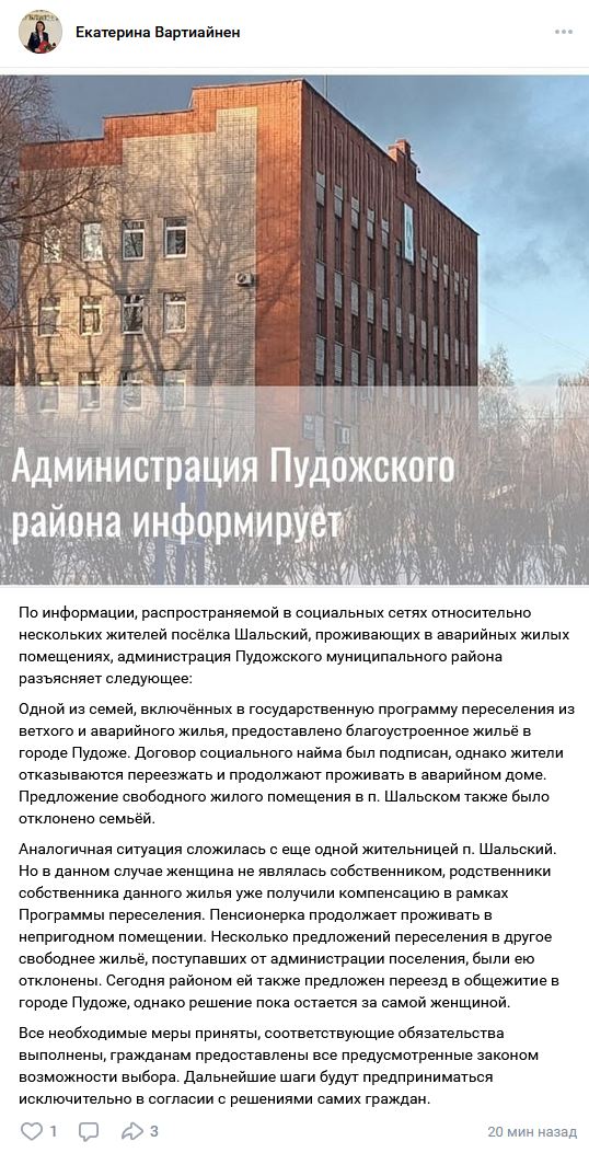 По словам временной главы Екатерины Вартиайнен, семье предоставили благоустроенное жилье в Пудоже, даже договор подписали, однако люди отказались переезжать, продолжая жить в аварийном доме. Чиновница отметила, что семье предлагали и другое помещение в поселке, но оно также было отклонено.