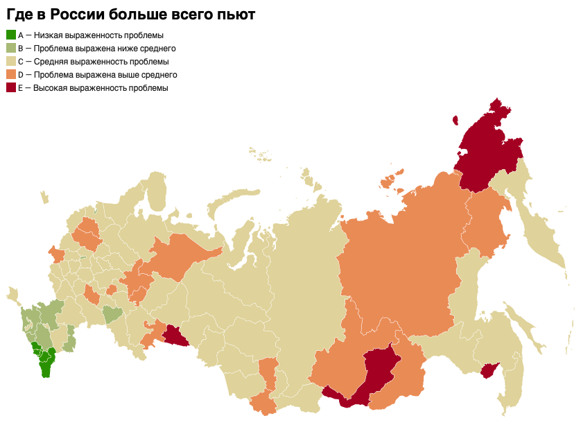 Выраженность проблемы с алкоголем на Смоленщине соответствует классу C, то есть оценивается как «средняя». Аналогичный уровень зафиксирован в соседних Калужской, Псковской и Московской областях. А вот в Брянской и Тверской дела обстоят несколько хуже — класс D, или «выше среднего».