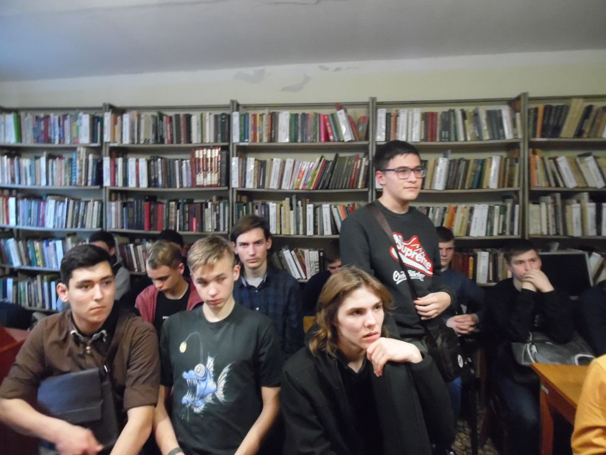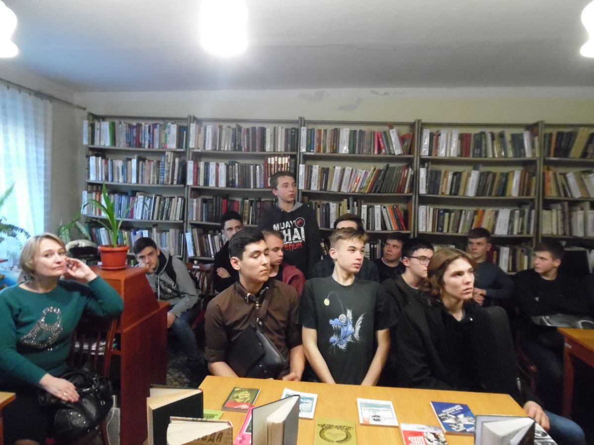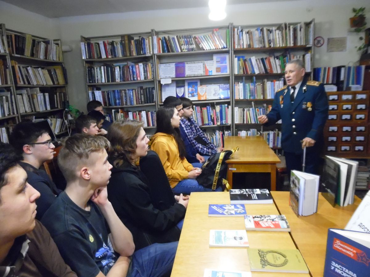 На встречу со студентами были приглашены полковник химической службы, ликвидатор аварии на Чернобыльской атомной станции Анатолий Николаевич Шаталин и полковник артиллерии, участник боевых действий в Афганистане Анатолий Леонидович Белов. В увлекательной беседе они рассказали о своей воинской службе и о событиях, в которых они принимали непосредственное участие, находясь в рядах вооруженных сил. Ребята задавали много вопросов гостям, интересовались их наградами, особенностями службы в Афганистане и применением химического оружия в мире. Анатолий Леонидович Белов преподнес в дар библиотеке книгу Александра Разумова «Время выбрало нас» от ветеранов боевых действий Крымской региональной организации РСВА.