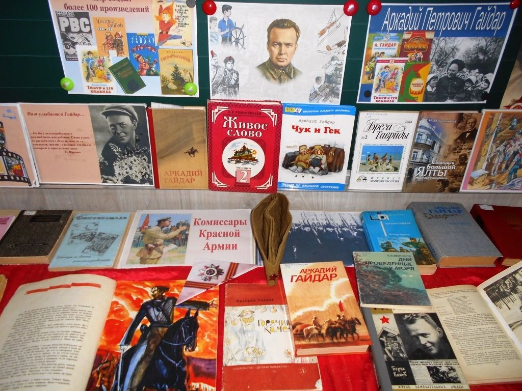По мотивам произведений писателя (а их свыше 100) снято более 20 мультфильмов и телевизионных фильмов. Многие произведения Аркадия Петровича включены в школьную программу, а сам писатель по сей день входит в список самых читаемых детских писателей. Вниманию ребят были представлены отрывки из советских художественного фильма «Тимур и его команда» и мультипликационного фильма «Горячий камень», созданных по произведениям Гайдара. В своем рассказе библиотекари сделали особый акцент на «крымский» период жизни и творчества писателя. Именем Гайдара в Крыму названы библиотеки и улицы. В годы гражданской войны Аркадий воевал на Крымском фронте, позднее часто бывал в Алупку, где проходила лечение его мама, приезжал в «Артек» пообщаться с артековцами, отдыхал и лечился в Доме отдыха и творчества писателей в Ялте.