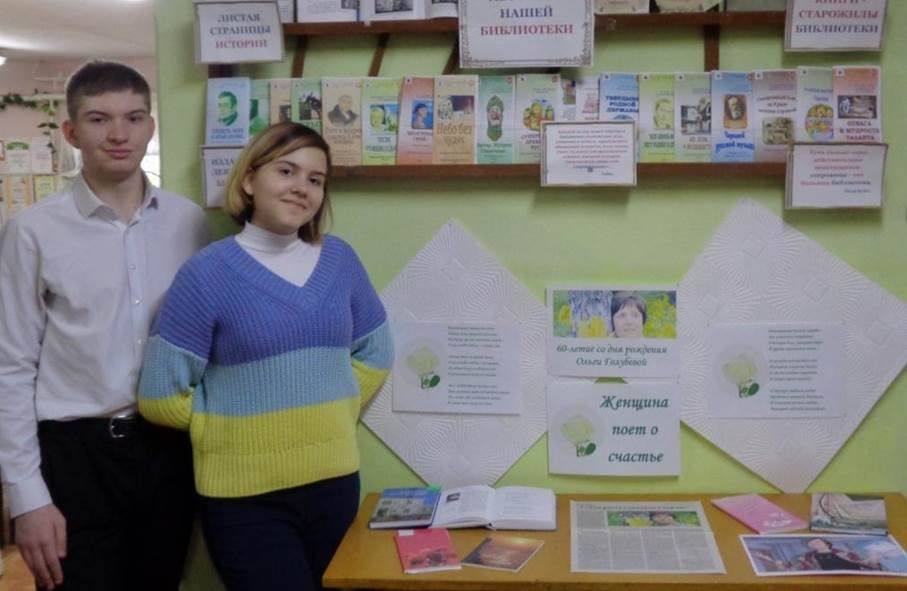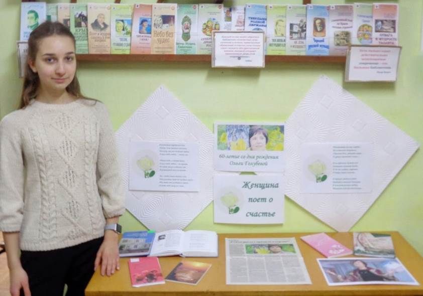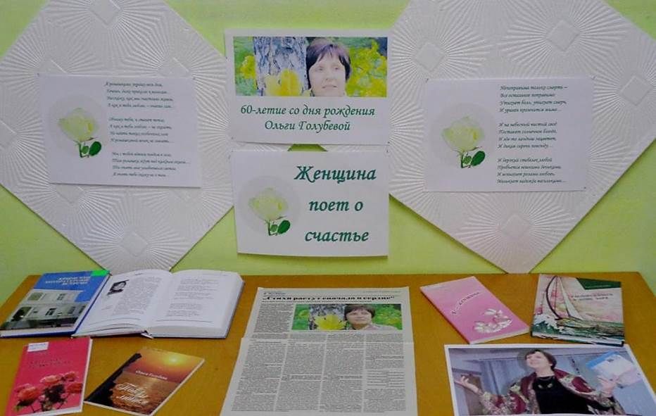 27 января, в преддверии юбилея крымской поэтессы Ольги Владимировны Голубевой, сотрудники библиотеки-филиала № 4 им. М.М. Коцюбинского МБУК ЦБС для взрослых МОГО Симферополь организовали выставку-поздравление «Женщина поет о счастье».