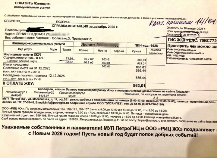 — А куда обратиться по поводу повышения тарифов за жилищные услуги с декабря 2025 г. в МУП «Петрогиц»? Тариф повысился на 47% (с 586,44 до 863,01 рубля). В каком городе такое еще может быть? Мы в шоке! — говорит женщина.