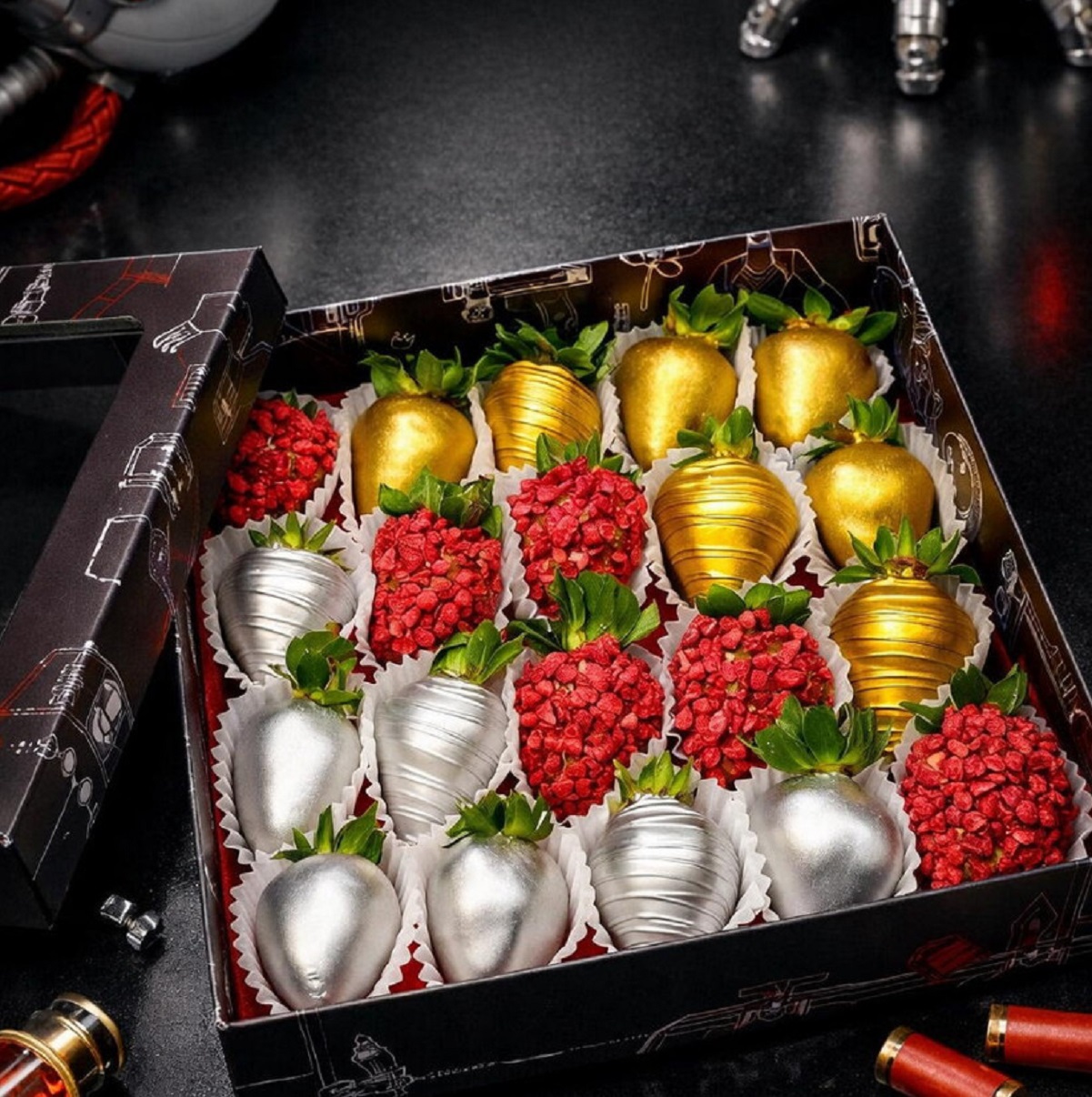 Также для коллаборации с «Флаувау» подготовили «серебряную» клубнику в шоколаде и бенто-торты. Взглянуть на новинки можно на фотографиях ниже.