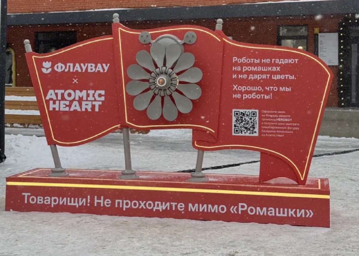 А ещё коллаборация Atomic Heart и «Флаувау» сопровождается арт-объектом «Ромашка», который установили на «Хлебозаводе» в Москве. Поклонники шутера должны сразу вспомнить камеры, которые засекают главного героя и натравливают на него суровых роботов. Однако воплощение «Ромашки» в реальном мире символизирует любовь и заботу.