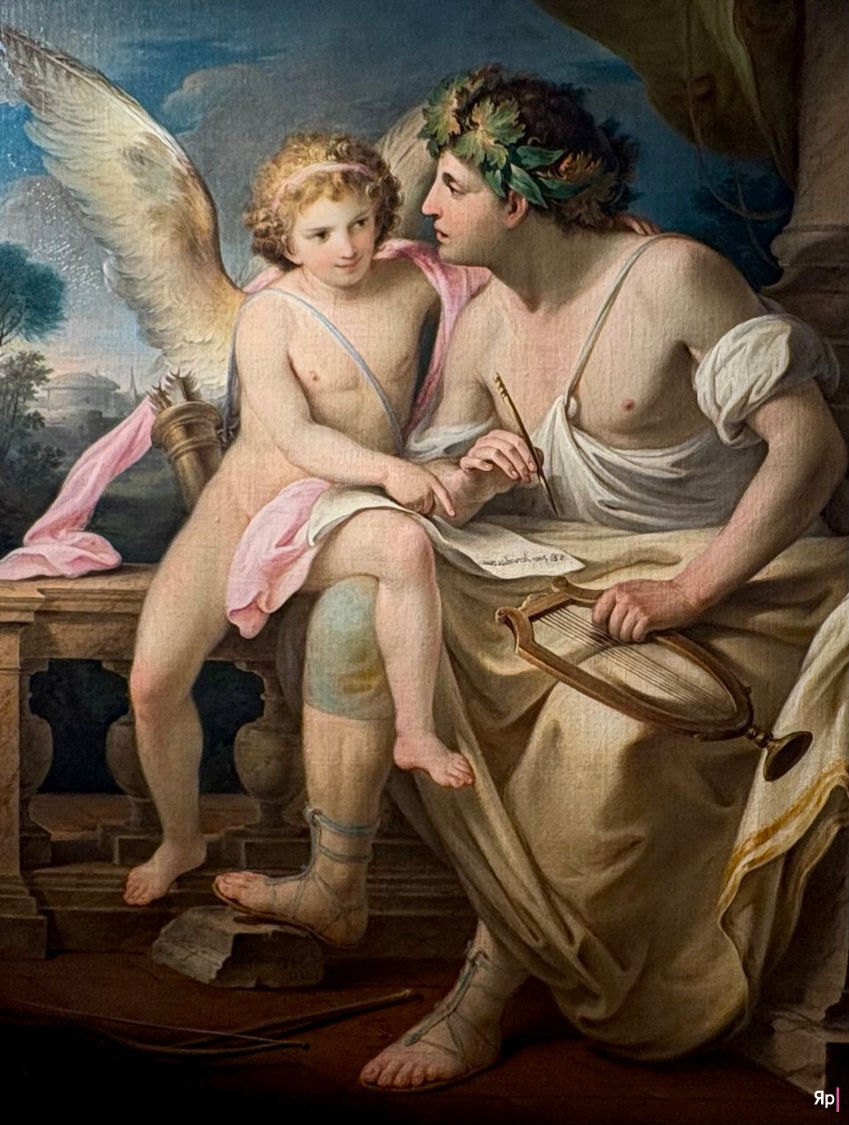 После трагичного сюжета о выборе между свободой и несвободой нас встречает сюжет Якопо Амигони «Зефир и Флора». Здесь всё дышит любовью: западный ветер нежно касается руки богини, пока она надевает венок, а в небе, словно живые облака, парят амуры. Этот союз — про нежность, про то мгновение, когда мир замирает и ничего, кроме них двоих, не существует.