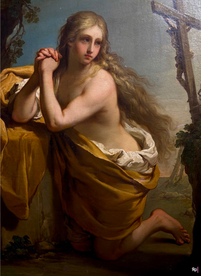 После Петербурга мы переносимся в пустынное место, где первое, что замечаем, это волосы. Золотая парча, тончайшая паутина прикрывают наготу истлевшей одежды. Это картина «Кающаяся Мария Магдалина» Гаэтано Гандольфи. Руки женщины сложены в жесте, который не требует слов: пальцы нежно сжимают друг друга, словно ища опору только в себе. Это покаяние без надрыва, тихая печаль о прошлом, которая очищает, а не карает. Глаза Магдалины смотрят мимо зрителя, в свою собственную вечность, оставляя нас лишь свидетелями её молчаливого диалога.