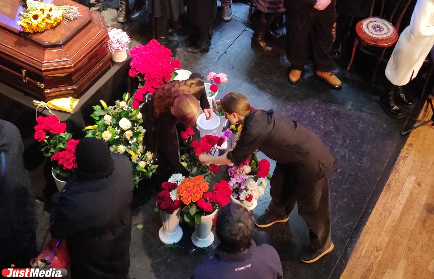 Под речи выступающих зрительский зал заполняется почти полностью. Люди проходят с трудом, а перед сценой образуется два сидячих «ряда» на полу. Посетители по очереди выходят к гробу Николая Коляды, их поток и не думает иссякать. Почти все приносят цветы: их так много, что работники театра относят старые букеты в служебное помещение, чтобы освободить вазы для новых. Подозреваем, что иначе сцену завалило бы цветами до потолка.