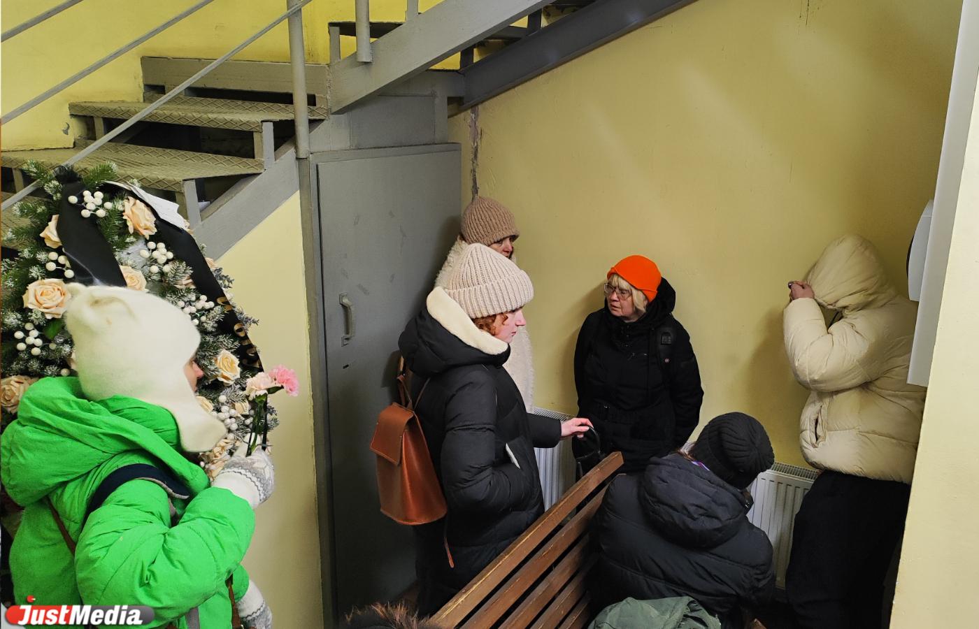 Люди, ошарашенные таким поворотом событий, стоят с нами у входа в «Коляда-театр». В 11 утра двери откроются и начнется церемония прощания. Толпа народу собралась, как минимум, за полчаса до события. Цепочка скорбящих растянулась на полквартала и продолжает расти. Многие стоят с цветами — их принесли вдобавок к тем, что ранее положили в стихийном мемориале у входа. Его замело снегом, что усиливает печальный настрой.