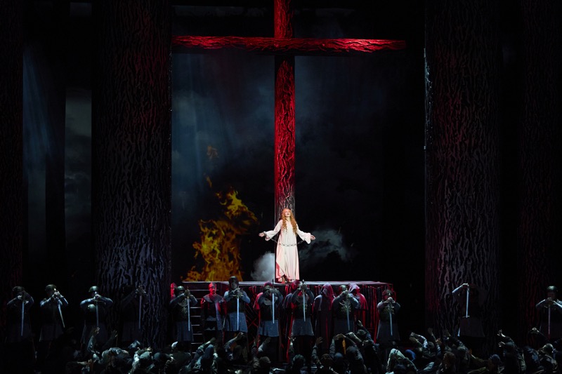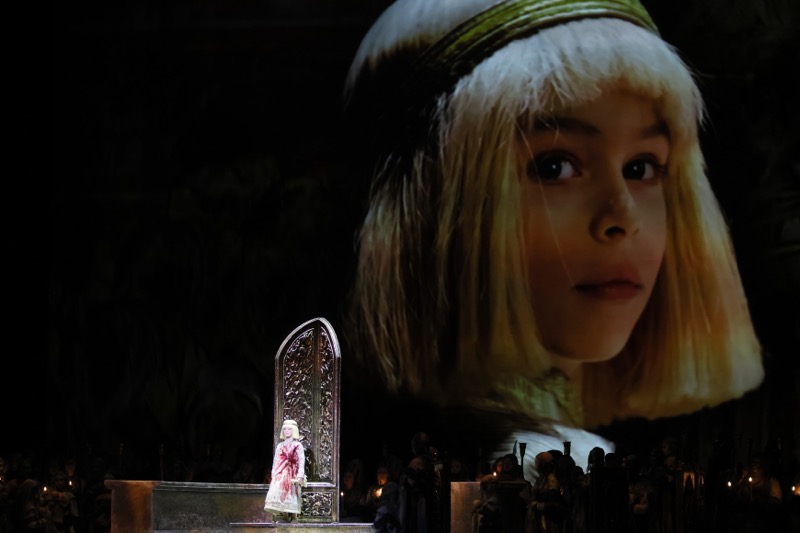 Доверительно живые и абсолютно реалистичные режиссерские мизансцены существуют в сложносочиненном, однако фактически простом – лишь точно угаданном – театральном абрисе абстрактного реализма, на который историческая эпоха сюжета спроецирована предельно лаконично, но выразительно: в сценографии это элементы готики и узнаваемые символы видеоряда, в костюмах – удивительно живописная и сочная стилизация под эпоху средних веков. Всё это тонко приправлено пасторальностью и романтикой образов природы. И вот оно, режиссерское кредо: «Мы ведь ставим не историческую оперу “про рыцарей”, а романтическую, даже метафизическую оперу. Огонь – лейтмотив всего спектакля, символ всеобъемлющего пламени, в котором сгорает весь мир с его безумием войн и ненависти. И над этим огнем с улыбкой святой возвышается Орлеанская дева».