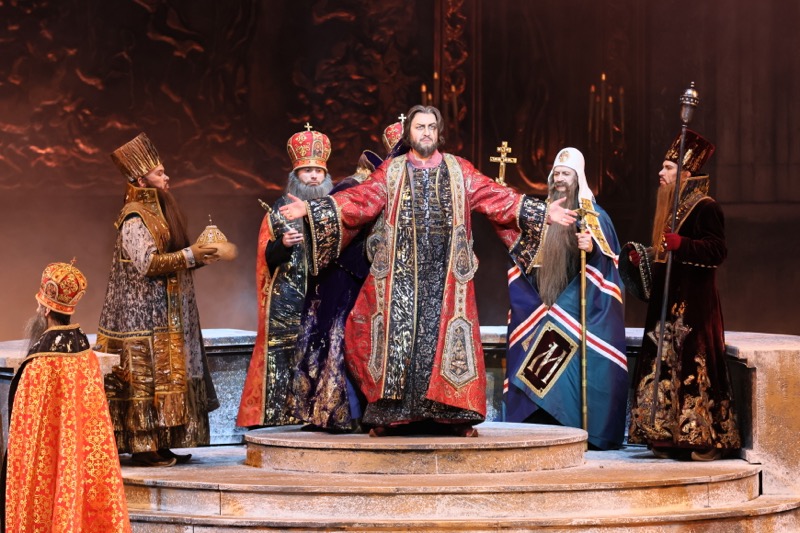 Премьера «Бориса Годунова» Мусоргского – серия из пяти спектаклей – состоялась с 6 по 8 февраля нынешнего года. В титульной партии выступали разные исполнители, но ключевой фигурой премьеры стал Ильдар Абдразаков. В афише марта в титульной партии этой постановки появились новые имена, и на дневном спектакле 14 марта партию русского царя Бориса исполнил Михаил Петренко. На этот раз речь идет о первой авторской редакции 1869 года, не принятой к постановке Дирекцией императорских театров, то есть о компактной самодостаточной версии в семи картинах, польский акт в которой, написанный позже, изначально не предполагался вовсе.