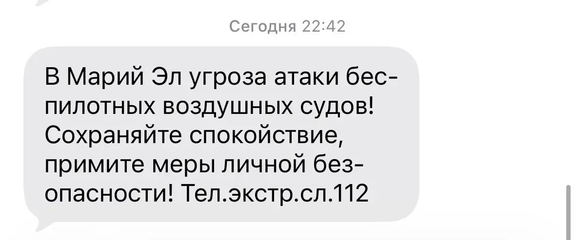 «В Марий Эл угроза атаки беспилотных воздушных судов! Сохраняйте спокойствие, примите меры личной безопасности», — говорится в тексте СМС.