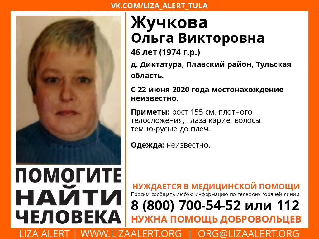 Жучкова Ольга Викторовна, 46 лет, жительница д. Диктатура, ушла из дома 22 июня С тех пор о ней ничего не известно.