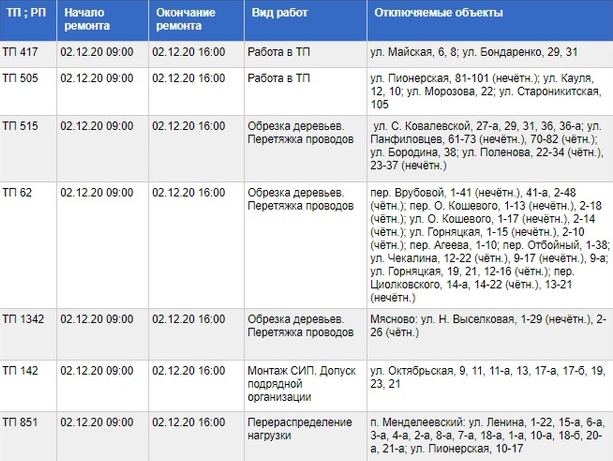Публикуем график проведения работ и список адресов, по которым будет производится отключение электричества: