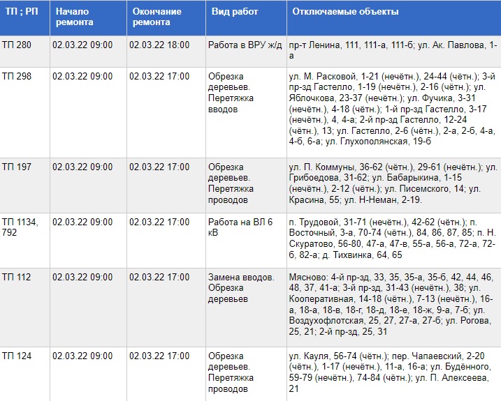 Публикуем график проведения работ и список адресов, жители которых временно останутся без электричества: