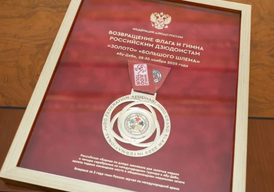 Накануне в Министерстве спорта Российской Федерации прошла рабочая встреча с президентом Федерации дзюдо России Сергеем Соловейчиком. Он передал в Музей спорта России уникальный экспонат — копию первой золотой медали, которую завоевал российский дзюдоист Аюб Блиев в ноябре 2025 года на турнире «Большого шлема» в Абу-Даби.