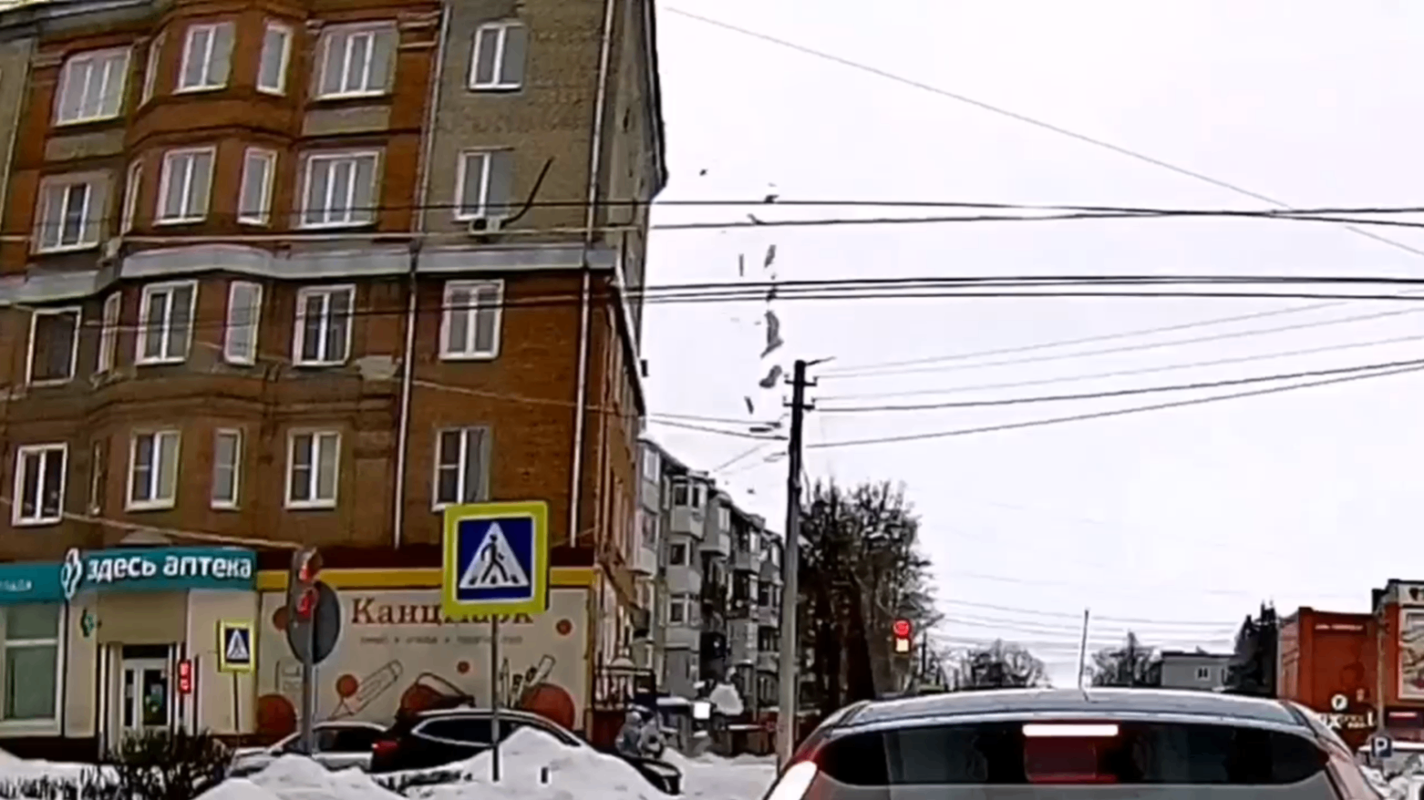 На видео можно увидеть, как несовершеннолетние стоят на пешеходном переходе, а в этот момент рядом с ними падает снег и лёд с многоэтажного дома.